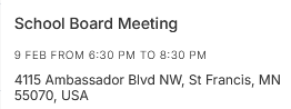 St. Francis School Board Meeting St. Francis School Board Meeting 6:30 pm – 8:30 pmFebruary 9, 2026 https://www.isd15.org/events?view=cal-month St. Francis School Board Meetings4115 Ambassador BlvdSt. Francis, MN 55070View LocationMap St. Francis School Board Meetings iCal Google View full calendar D Jeanne Anoka-Hennepin School Board – Work Session February 9, 2026 SD31 DFL Monthly Social Gathering and Business Meeting at DAVANNI’S February 10, 2026